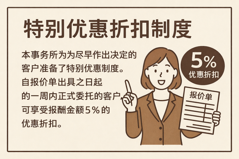 ※ 如内容与本事务所业务无直接关联,我们可能无法为您提供答复,敬请谅解。此外,制作材料清单、制作申请文件等属于超出“咨询”范围的事项,将在您正式委托后为您办理。